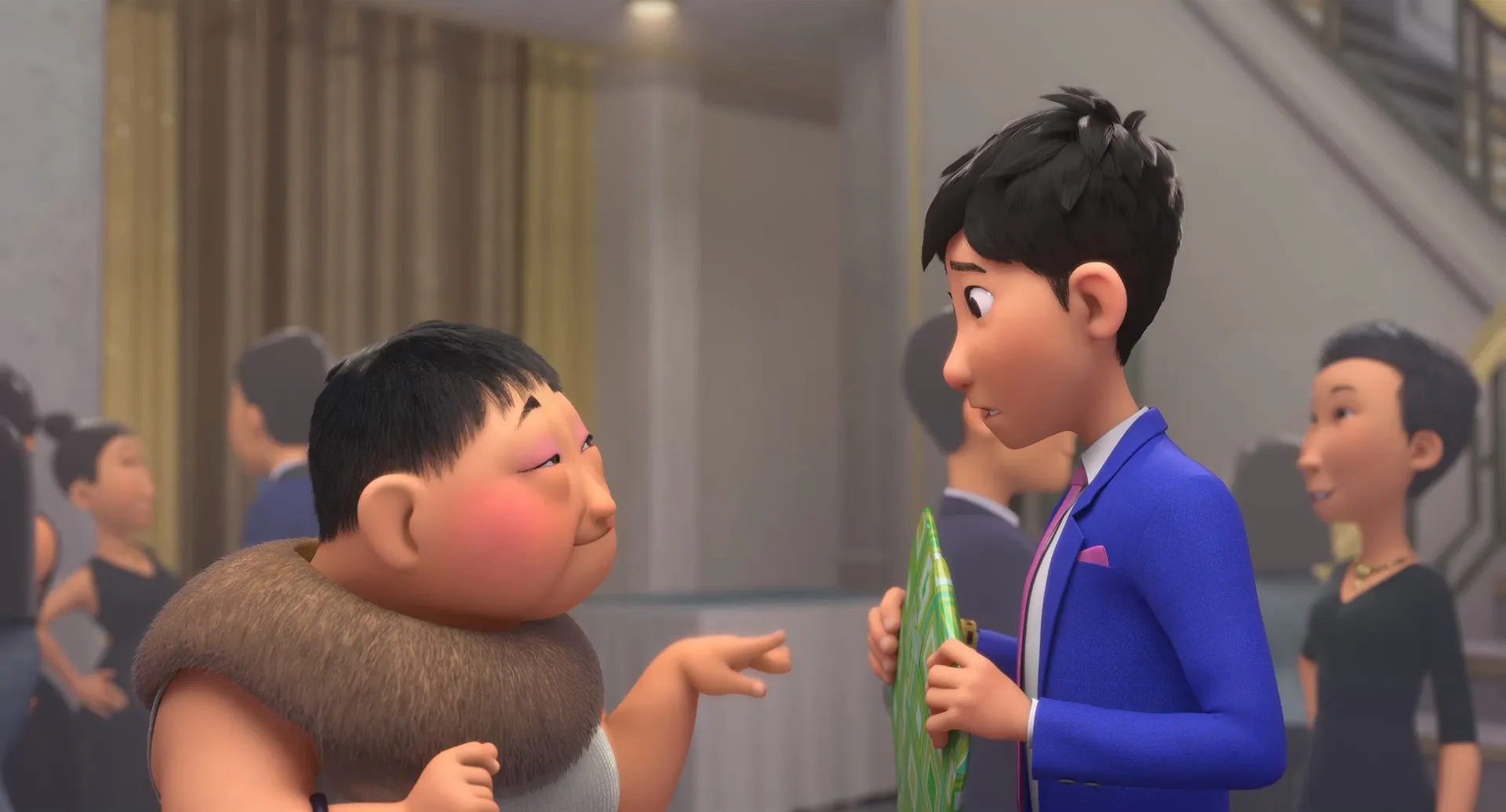 Jimmy Wong as Din (voice), John Cho as Long (voice), Constance Wu as Mom (voice), Natasha Liu Bordizzo as Lina (voice), Jimmy O. Yang as Short Goon / Security Guard 2 (voice), Aaron Yoo as Pockets (voice), Will Yun Lee as Dad (voice), Bobby Lee as Tall Goon (voice), Nico Santos as Buckley (voice), Ronny Chieng as Pipa God (voice), Ian Chen as Young Din (voice), Sumalee Montano as Granny Neighbor / Cougar / Party Guest (voice), David So as Construction Worker / Neighbor (voice), Gustav Lindquist as Security Guard 1 & 3 / School Bully (voice), Alexandre Chen as Various characters (voice), Alyssa Abiera as Young Li Na (voice), Gabriel Lee as Wen / DJ / K-Drama Man (voice), Chris Appelhans as Hot Towel Waiter / Nomani Retailer (voice), Rad Sechrist as Maitre D' / Additional Waiter (voice), Cathy Cavadini as Additional Voices (voice), Levi Nunez as Additional Voices (voice), Nora Wyman as Additional Voices (voice), Jeremy Maxwell as Additional Voices (voice), Lee Chen as Additional Voices (voice), James Taku Leung as Additional Voices (voice), Constance Parng as Additional Voices (voice), Malana Lea as Additional Voices (voice), Victor Chi as Additional Voices (voice), Elizabeth Pan as Additional Voices (voice), Paul Kwo as Additional Voices (voice), Kathy Wu as Additional Voices (voice), Wilky Lau as Additional Voices (voice), Willow Geer as Additional Voices (voice), Will Collyer as Additional Voices (voice), Regina Taufen as Additional Voices (voice), David Arnott as Additional Voices (voice), Simon Twu as Additional Voices (voice)