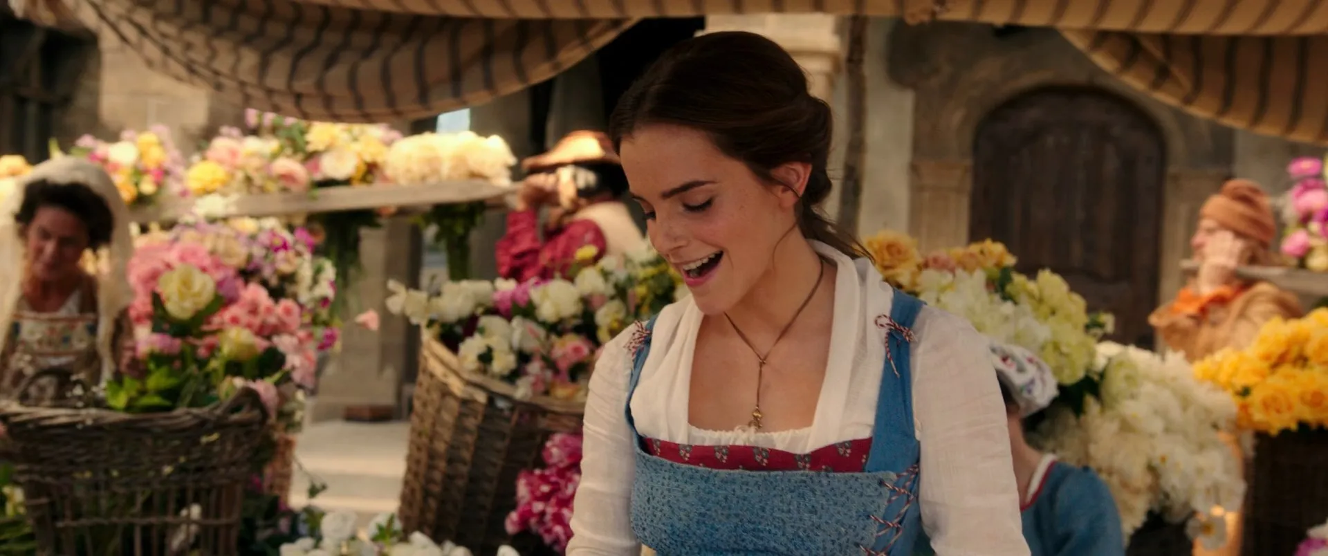 Emma Watson as Belle, Dan Stevens as Beast, Luke Evans as Gaston, Josh Gad as LeFou, Kevin Kline as Maurice, Hattie Morahan as Agathe / Enchantress, Haydn Gwynne as Clothilde, Gerard Horan as Jean the Potter, Ray Fearon as Père Robert, Ewan McGregor as Lumière, Ian McKellen as Cogsworth, Emma Thompson as Mrs. Potts, Nathan Mack as Chip, Audra McDonald as Madame Garderobe, Stanley Tucci as Maestro Cadenza, Gugu Mbatha-Raw as Plumette, Clive Rowe as Cuisinier, Thomas Padden as Chapeau, Rita Davies as Old Woman, D.J. Bailey as Vagrant, Adrian Schiller as Monsieur D'Arque, Harriet Jones as Queen, Adam Mitchell as Young Prince, Tom Turner as King, Michael Jibson as Tavern Keeper, Zoe Rainey as Belle's Mother, Daisy Duczmal as Baby Belle, Jolyon Coy as Young Maurice, Jimmy Johnston as Tom, Dean Street as Dick, Alexis Loizon as Stanley, Sophie Reid as Village Lass, Rafaëlle Cohen as Village Lass, Carla Nella as Village Lass, Obioma Ugoala as Flirtatious Farmer, Lynne Wilmot as Barmaid, Jane Fowler as Pretty Female Fishmonger, Alison Harding as Head Washer, Chris Andrew Mellon as Nasty Headmaster, Jemma Alexander as Housewife, Sandy Strallen as Cobbler, Dale Branston as Baker, Daniel Ioannou as Barber, Peter Challis as Butcher, Wendy Baldock as Washer Woman, Norma Atallah as Washer Woman, Leo Andrew as Apothecary, Steven Butler as Cheese Maker, Sharon Gomez as Cheese Maker, Jacqui Jameson as Cheese Maker, Vivien Parry as Village Lass's Mother, Simone Sault as Wood Carrier, Beth Willetts as Jam Seller, Mandy Montanez as Bread Buyer, Tom Oakley as Fishmonger, William Bozier as Stable Boy, Jak Allen-Anderson as Apothecary's Patient, Phil Grannel as Fiddler, Freddie August as Fiddler, Nicola Keen as Female Villager / Celebration Woman, Ebony Molina as Female Villager / Celebration Woman, Alison Jenkins as Female Villager / Celebration Woman, Ellen O'Grady as Female Villager, Dawn Buckland as Female Villager, Rebecca Mckinnis as Female Villager, Jody Hall as Male Villager, Ben Fox as Male Villager, Nathan Vaughan Harris as Male Villager, Tim Stanley as Male Villager, Ben Clare as Male Villager, Marina Abdeen as Debutante, Danielle Acors as Debutante, Hayley Ainsley as Debutante, Rhianne Alleyn as Debutante, Gabby Antrobus as Debutante, Sophie Atkins as Debutante, Koko Basigara as Debutante, Holly Bluett as Debutante, Daisy Boyles as Debutante, Ava Brennan as Debutante, Sophia Brown as Debutante, Sophie Carmen-Jones as Debutante, Cassie Clare as Debutante, Tanya Cumberland as Debutante, Natalie Davis as Debutante, Paige Drury-Lawrence as Debutante, Stephanie Elstob as Debutante, Cordelia Farnworth as Debutante, Cj Field as Debutante, Lily Frazer as Debutante, Lucy Alexa Gilbert as Debutante, Helen Gulstan as Debutante, Selina Hamilton as Debutante, Leah Hill as Debutante, Abigayle Honeywill as Debutante, Chelsea Inez as Debutante, Blythe Jandoo as Debutante, Shireen Jathoonia as Debutante, Billie Kay-Piper as Debutante, Hannah Kenna-Thomas as Debutante, Ella Kora as Debutante, Jennifer Leung as Debutante, Emily Loumba as Debutante, Cassie Macmillian as Debutante, Fiona McDonald as Debutante, Samira Mighty as Debutante, Sonoya Mizuno as Debutante, Anna Momcilovic as Debutante, Nicola Mooi as Debutante, Nicole O'Neill as Debutante, Abiona Omonua as Debutante, Jazz Peters as Debutante, Courtney Pruce as Debutante, Kayla Radam as Debutante, Katie Singh as Debutante, Lucy St Louis as Debutante, Ruth Steele as Debutante, Jasmine Takacs as Debutante, Naomi Weijand as Debutante, Leah West as Debutante, Skye Lucia Degruttola as Washer Girl, Timia Julien-Box as Little Girl, Adelaide Morgan as Little Girl, Gemma Fray as Little Girl, Lara Decaro as Little Girl, Max Brophy as School Boy, Samuel Brown as School Boy, Daniel Daszek-Green as School Boy, Freddie Hunter as School Boy, Joey Brown as School Boy, Tom Burgering as School Boy, Nate Leung as School Boy, Kai Gordon as School Boy, Oscar Francisco as School Boy, Harry Marcus as School Boy, Johanna Smitz as Village Woman (uncredited)